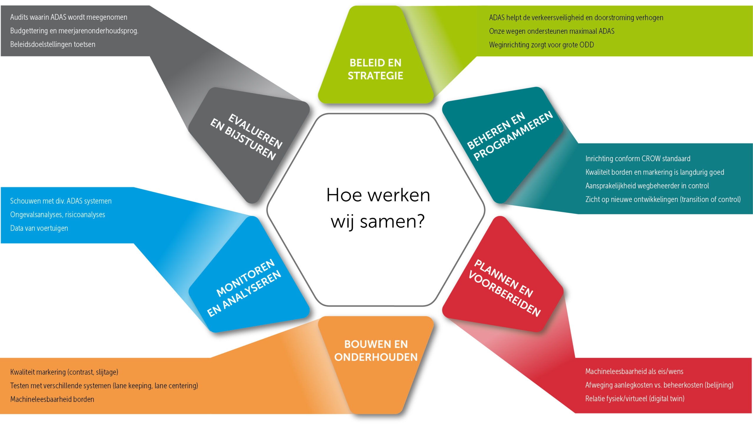 - Komen tot maatregelen en hulpmiddelen op verschillende niveaus (de sporen) die alle wegbeheerders kunnen helpen om te gaan met het fenomeen zelfrijdende auto.